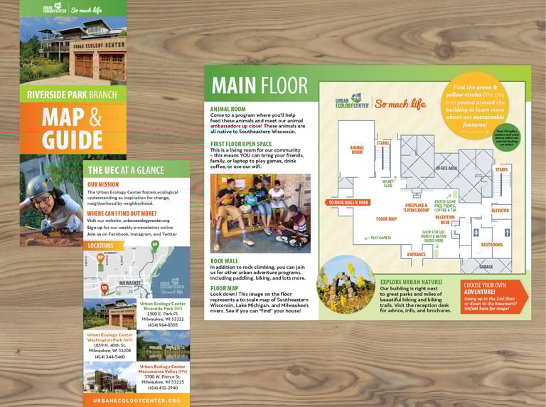 Rebranded UEC’s printed materials, including multiple brochures, branch location maps, information cards, building and park signage, program guides, newsletters, and more.
